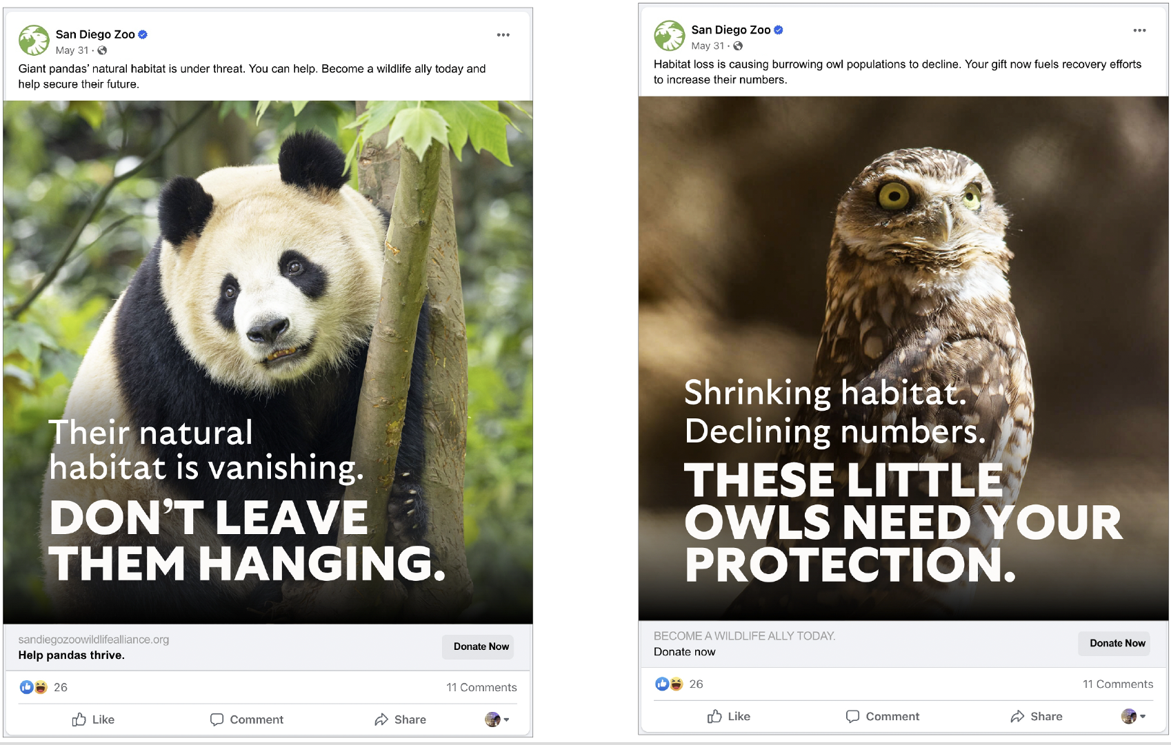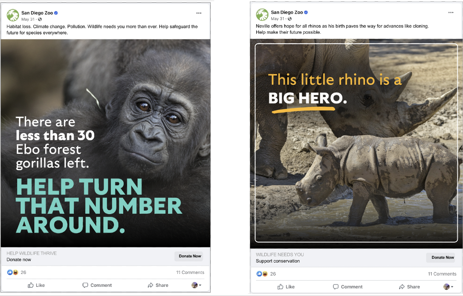 San Diego Zoo Wildlife Allliance is dedicated to protecting, saving, and caring for wildlife species worldwide. Social campaigns promote their global work, including recovery efforts for tiny burrowing owls in the American Southwest, monitoring elusive Ebo gorillas in forest canopies of Cameroon, and helping restore the extinct-in-the-wild northern white rhino.